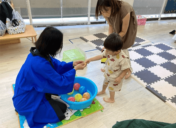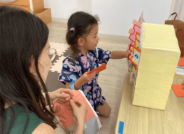 「まどあけゲーム」では引いたカードと同じ絵の窓をあけて何がはいってるかな?とのぞき込む姿が見られました。「ヨーヨー」では紙のお財布に入ったお金でおかいものをするのがとても楽しそうでした。