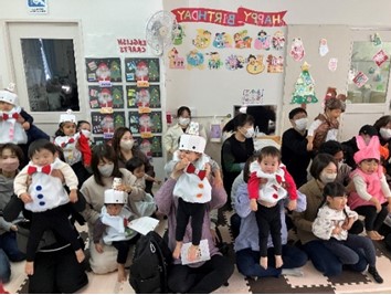 『ジングルベル』の歌に合わせて手作りのマラカスを鳴らしました。音楽が流れるとノリノリで体を弾ませる子もいて、楽しそうな姿がとても微笑ましかったホップ組さん。