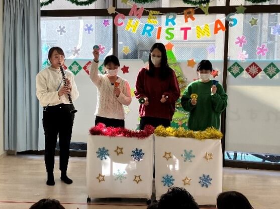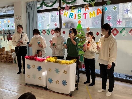 ピアノとクラリネットの音に合わせてハンドベルで『きらきら星』『ジングルベル』の2曲を披露しました。綺麗な音色にみんなうっとり聴き入っていました♪