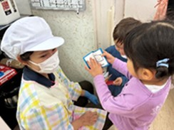 「Do you like~?」で好きな食べ物を聞いたり、「Yes, I do. / No, I don’t.」で答えたりすることも上手になった子どもたちは、英語サークルタイムの中で園内を歩き回って園長先生や給食の先生へのインタビューに挑戦!