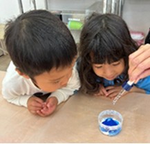 材料を混ぜ合わせるところから英語講師と一緒に行い、ふわふわの雪のような感触やトロッとした感触を作ったり、シュワシュワの泡を観察したり、何が起きるのかわからないドキドキな体験に子どもたちはいつも興味津々です!「なんで?」「すごい!」と感動を言葉にして楽しんでいます。