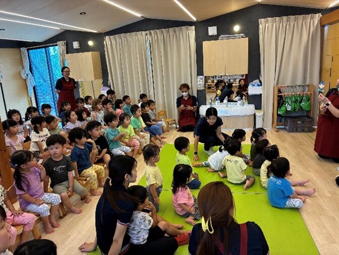 幼児クラスではペープサートを使った七夕のお話を聞きました。子ども達も歌で参加し、元気いっぱいの七夕の歌のおかげでカササギが集まり、橋になってくれて無事織姫と彦星は会うことができました!
