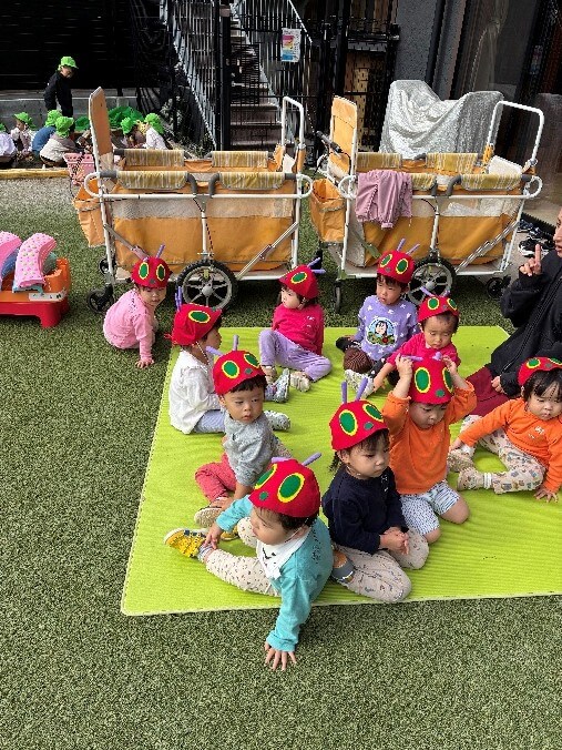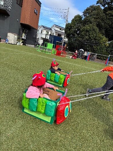 1歳児ラビット組さんは、お母さんお父さんとあおむしカートに乗って出発!
