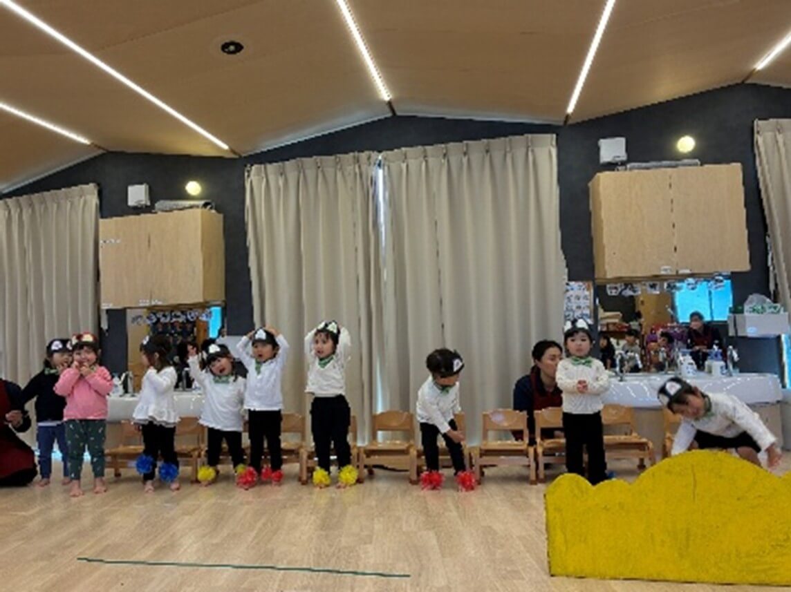 手の動きに合わせてお歌を楽しんでいたペンギン組さん。劇遊びでは、練習の時に緊張した表情だった子も、大きな声で堂々と発表する様子が見られました!