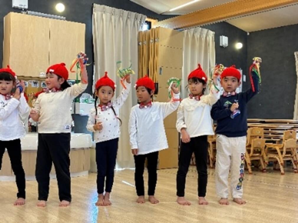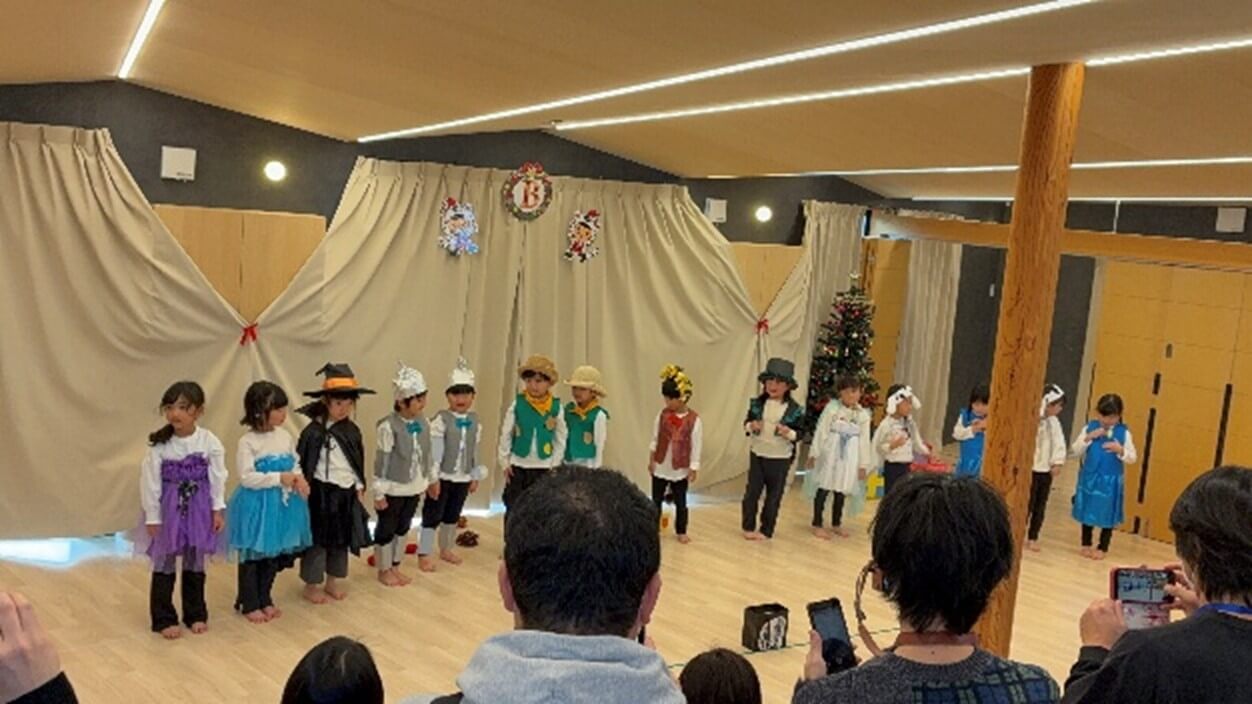 ラビット組は、普段からサークルタイムで行っている「B-I-N-G-O」のクリスマスバージョン「S-A-N-T-A」と「おべんとうバス」を発表しました。英語で出てくる体のパーツを指さしながら、歌に合わせてダンスを楽しんだラビット組さん。お家の方の前で堂々と発表できました!