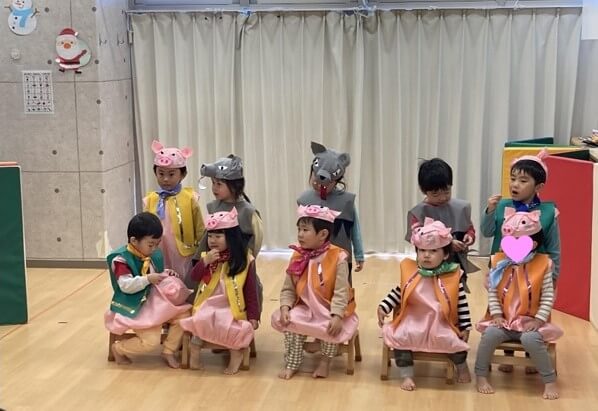 共同による劇「三匹のこぶた」はピンクのこぶたとおおかみの衣装に身を包んだ子ども達の楽しそうな笑顔がたくさん見られました。