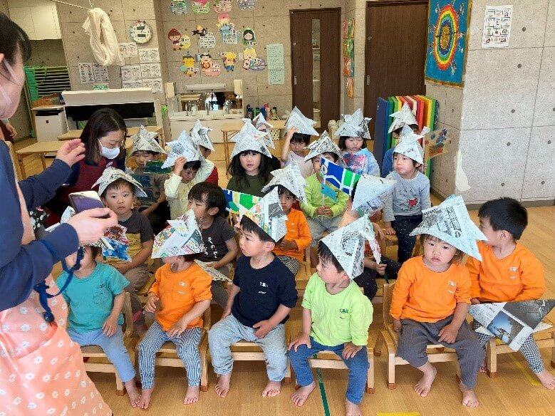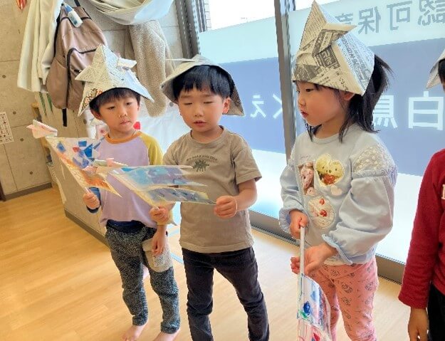 集いが始まる前には、自分が作ったこいのぼりを手に、新聞紙で作った兜を被って準備万端です!