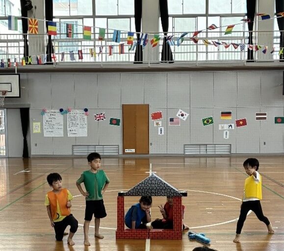 日頃子どもたちがしているごっこ遊びからヒントを得て、英語の先生が、音楽、ダンス、ストーリーをオリジナルで考えました。