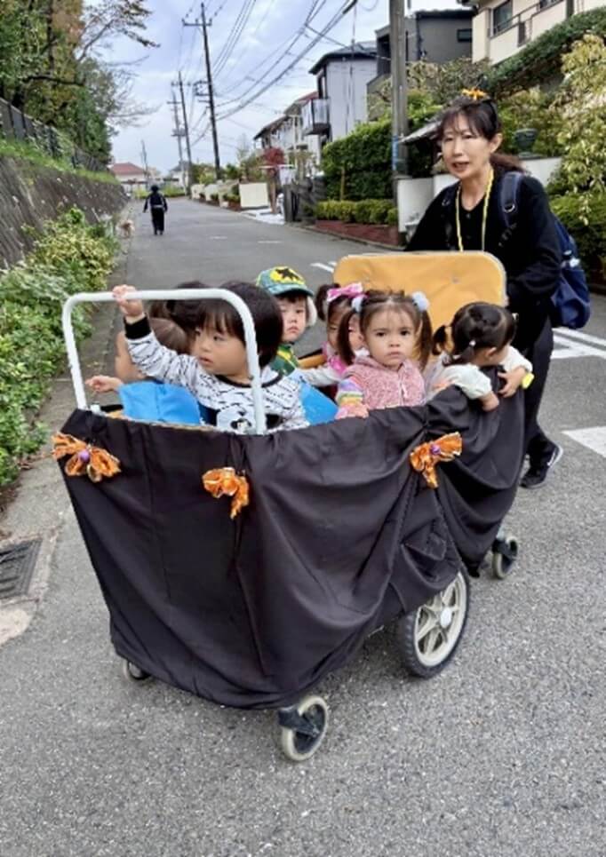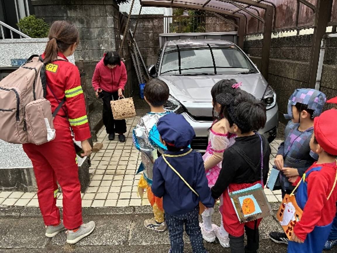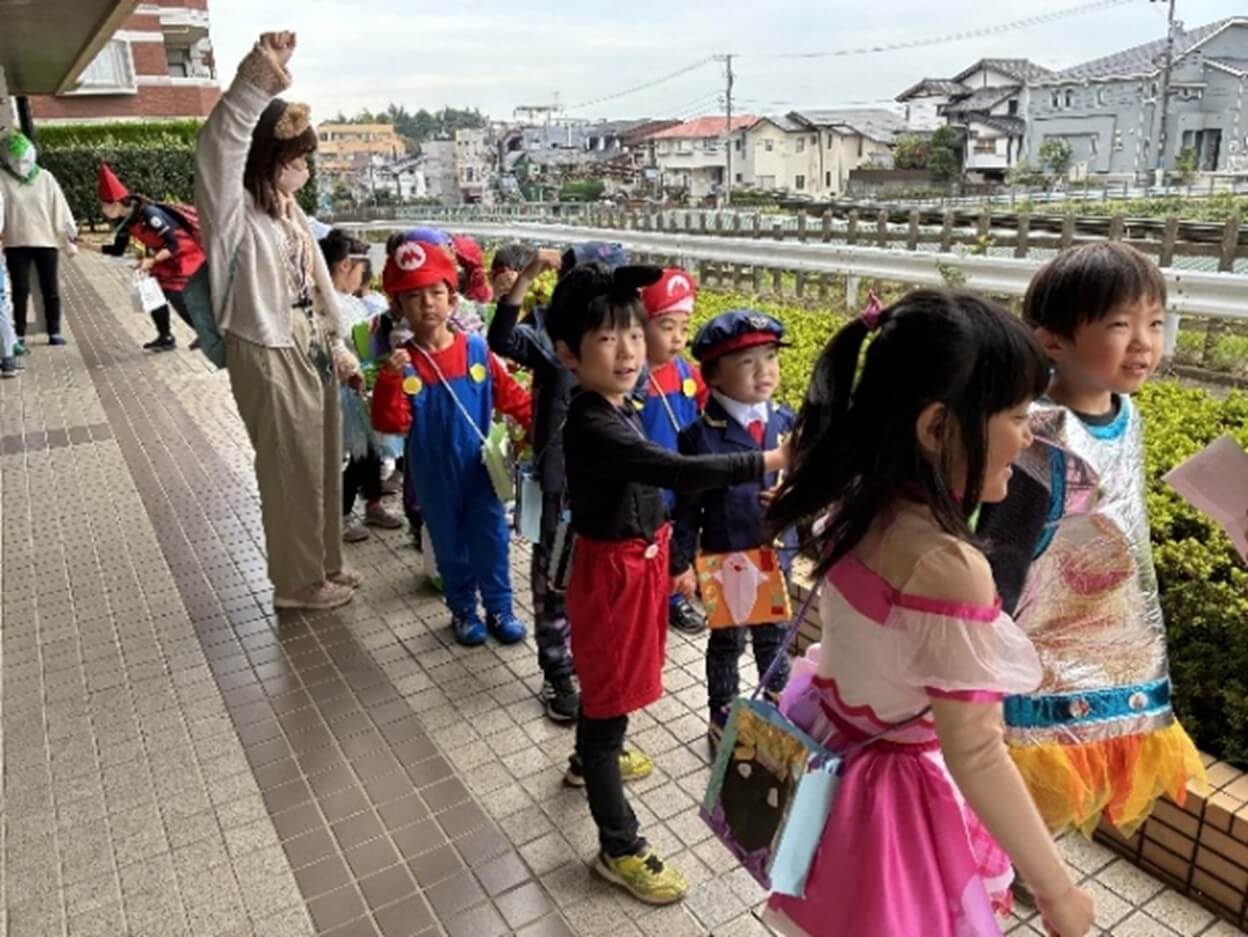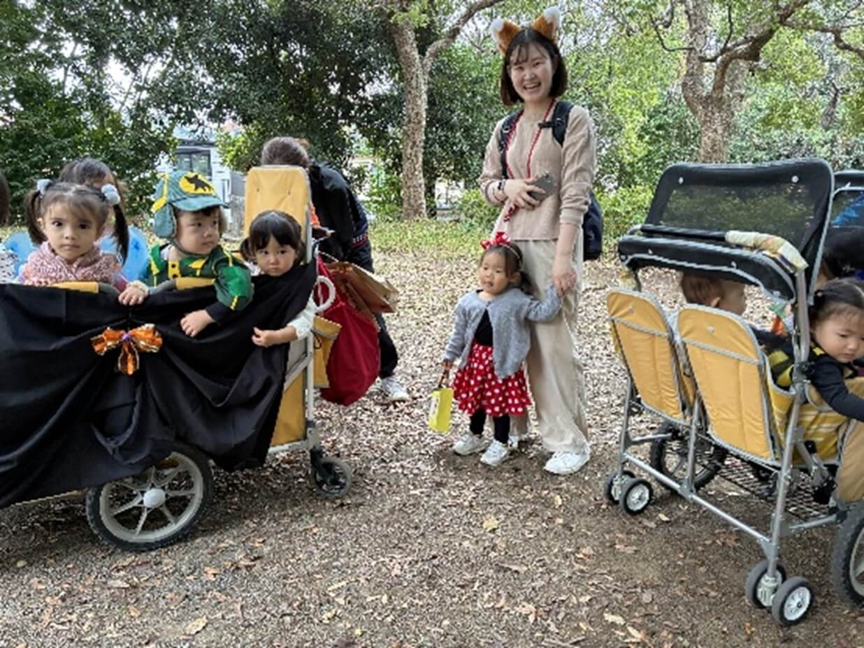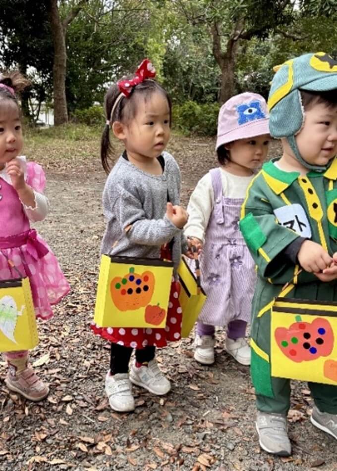 ハロウィンの由来を聞いて各クラスのハロウィンバッグのお披露目会をしたあとは、待ちに待ったお散歩に出発~。