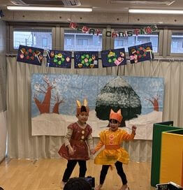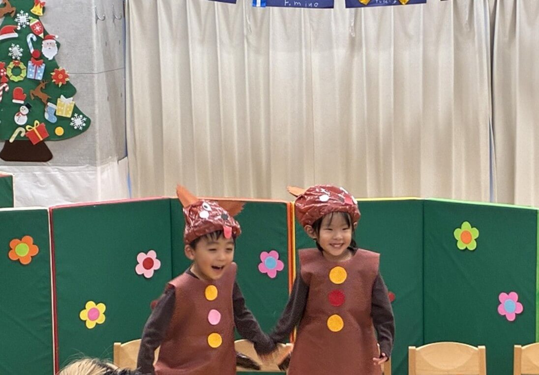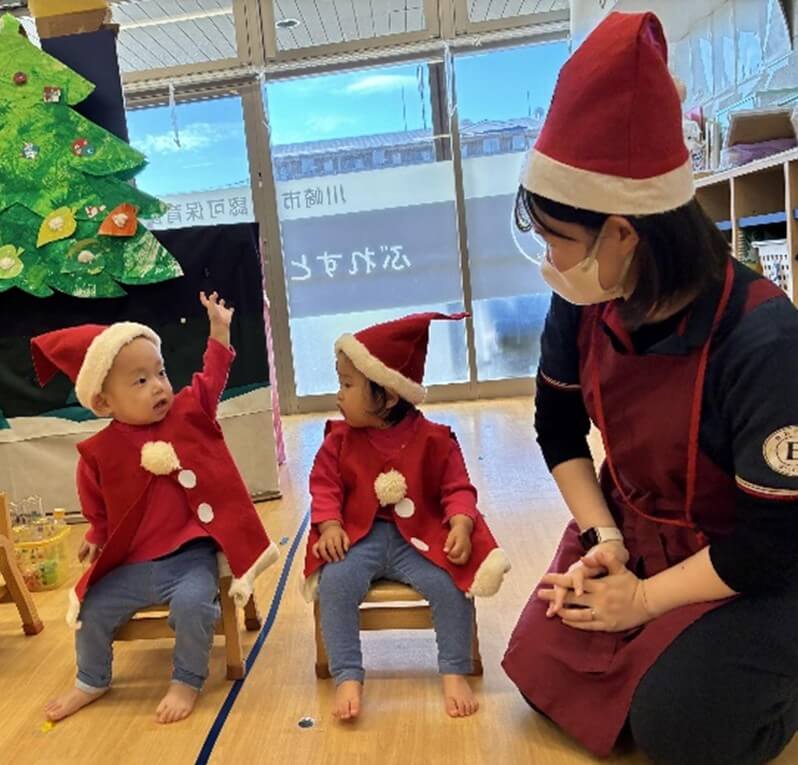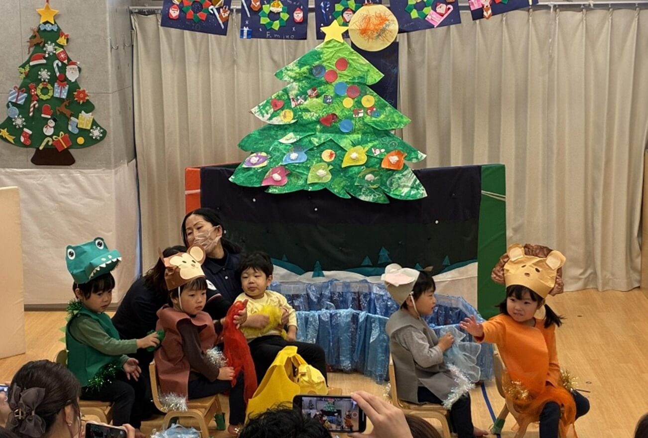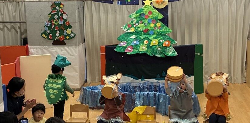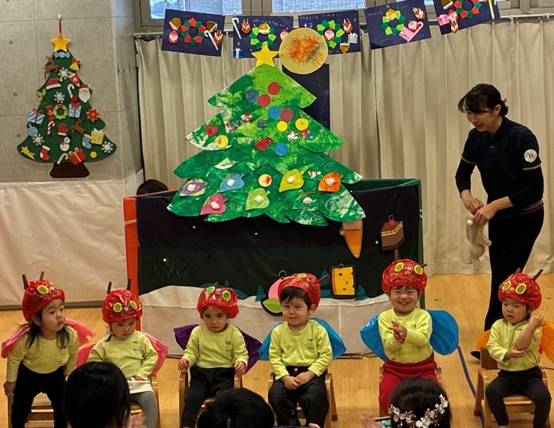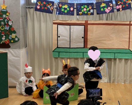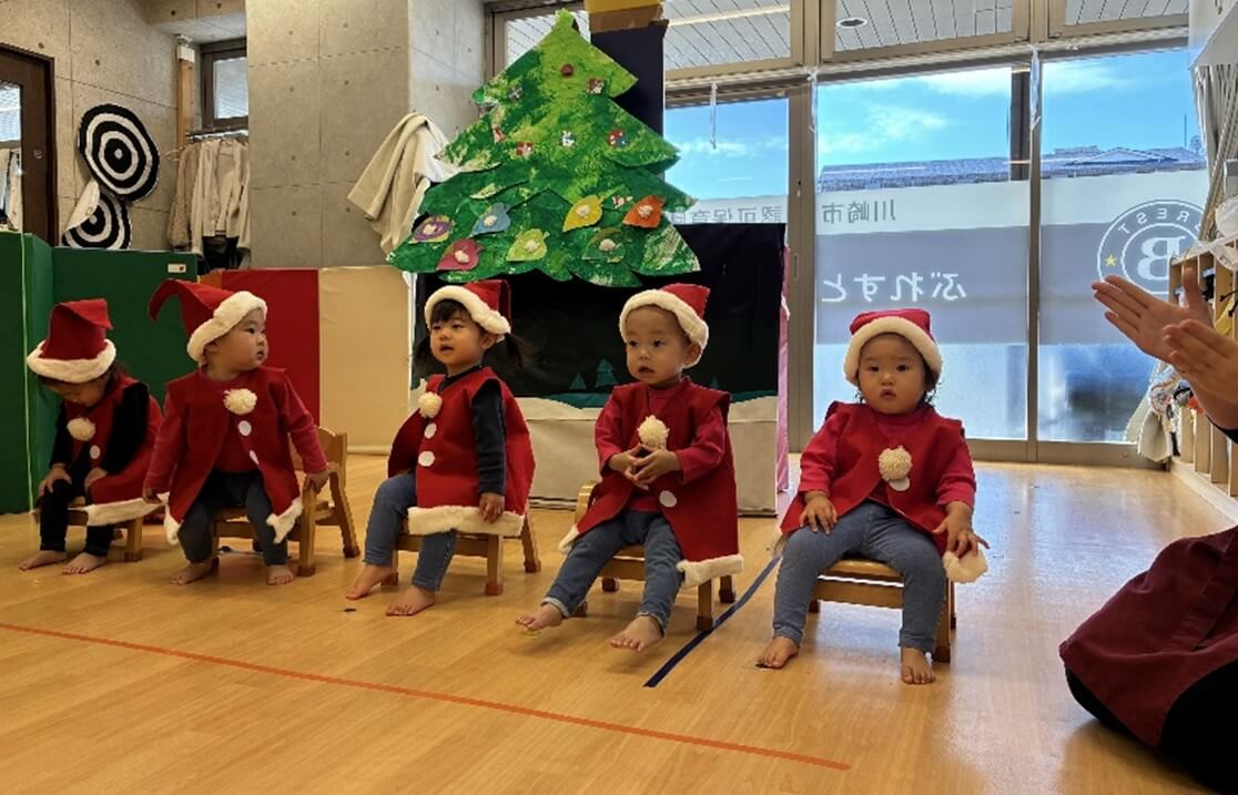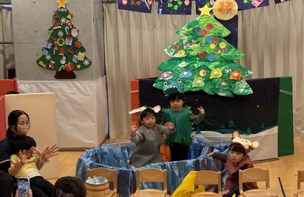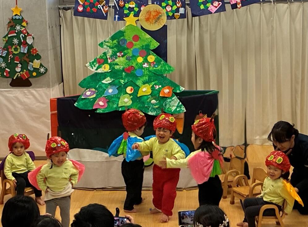 最後はみんなが大好きな「おもちゃのちゃちゃちゃ」でリズムに乗って体を動かし、発表会がふんわりとした空気に包まれました。初めてのクリスマス会は大成功でした。