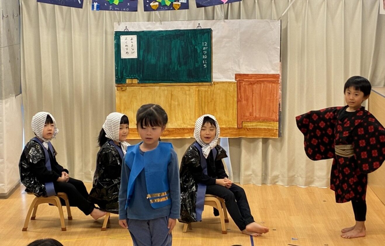 5歳児らいおん組の劇は、「どろぼう学校」です。年長組らしく、子ども達とどの劇にするか、配役、役の名前、セリフを考えました。ごっこ遊びが大好きならいおん組らしく、練習中にもスラスラとセリフがでてきたので、その時の気持ちを大切に作り上げました。