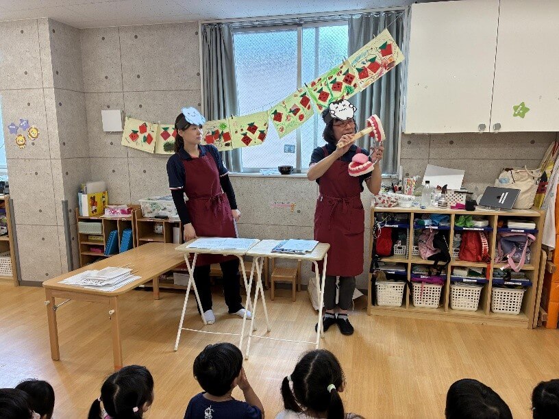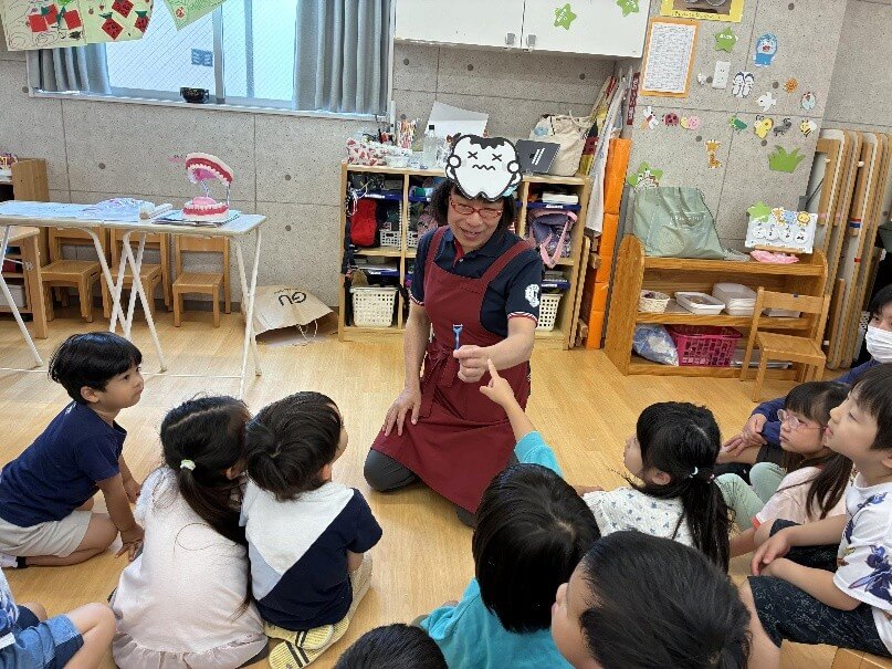 尻手ほいくえんでの歯の集会の様子をご紹介いたします。園では歯磨きの大切さや歯磨きの仕方について看護師と1歳担任が、お話をしました。