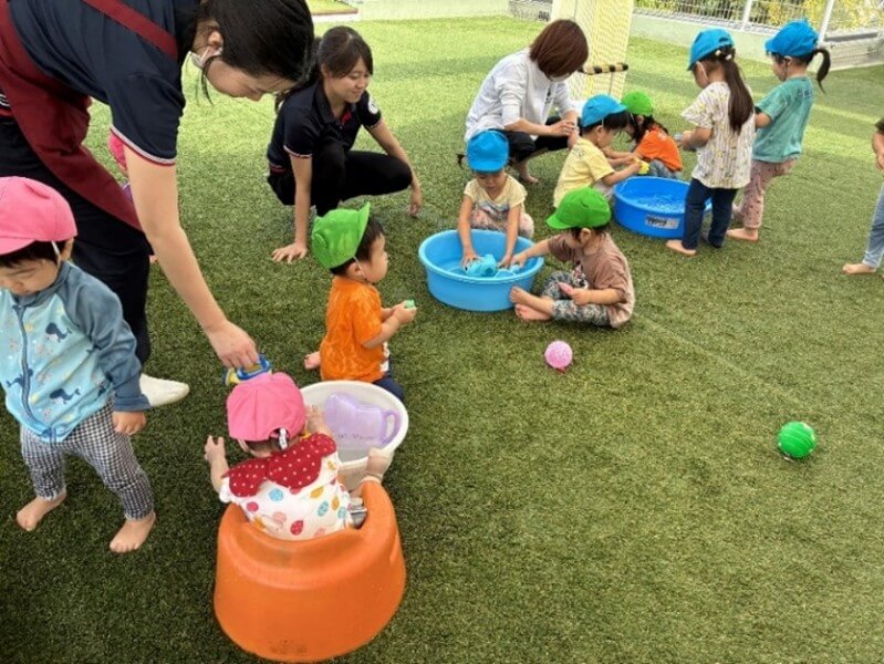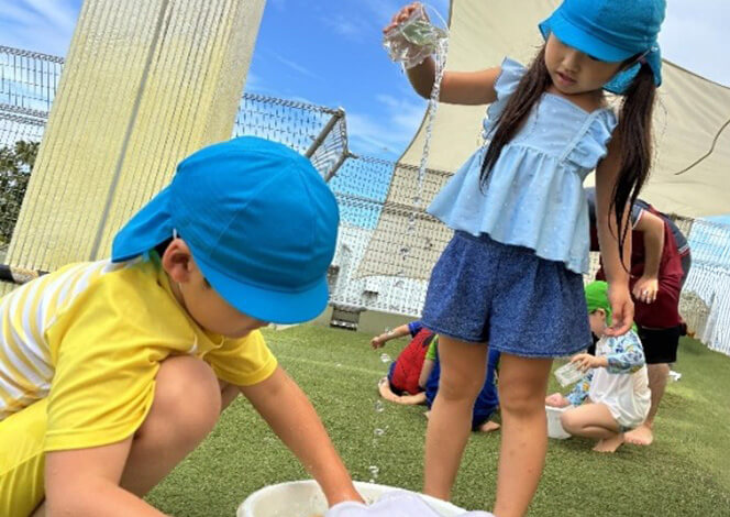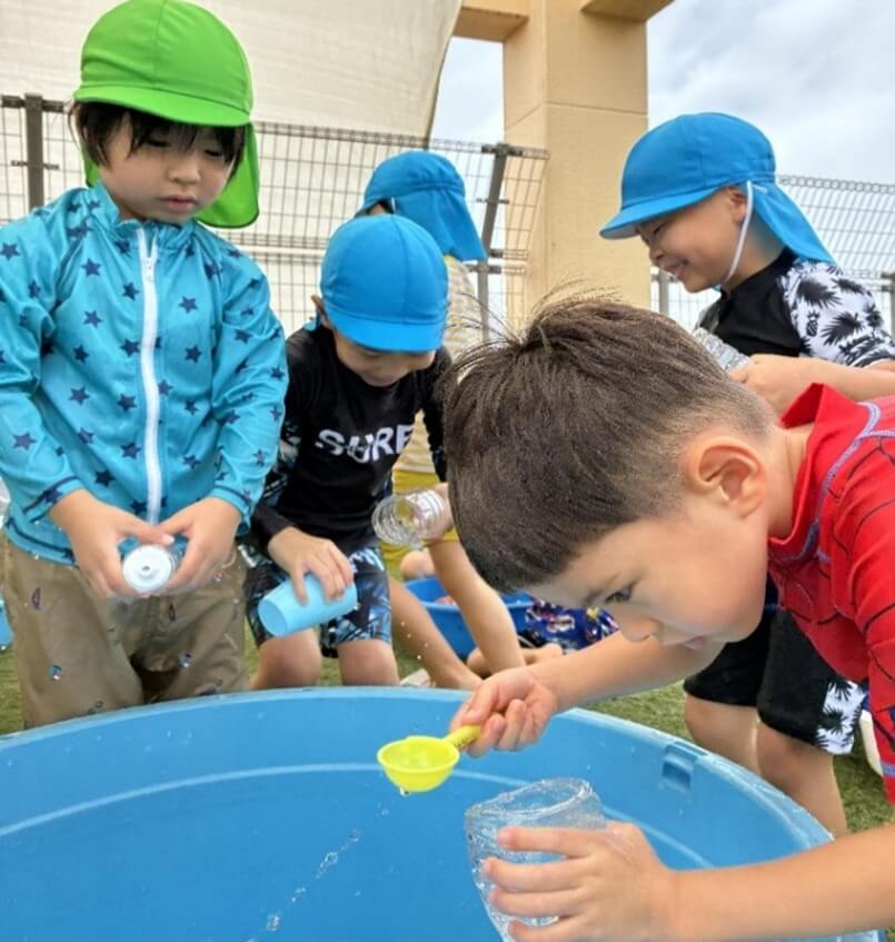 幼児クラスでは遊び方も様々で、ペットボトルを水汲みに