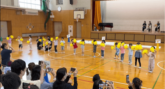 ジラフ組さんの「やってみよう」ではポンポンを持った可愛らしいジラフ組さんが登場!やってみよう!の掛け声に合わせ一生懸命に踊るジラフ組さんはとても可愛かったです。