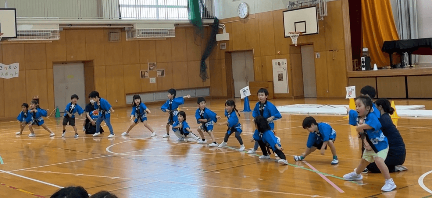 最後はライオン組さんの「ソーラン節」でした。太鼓の音と「ヤー!」と声をあげながら集まり、ダンスを披露するライオン組さんはとても迫力があり、ほいくえん最後の運動会に相応しい、格好良い姿が見られました。