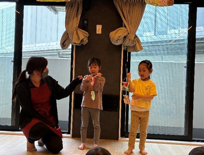 まずは、こどもの日はどんな日なのか、なぜこいのぼりを飾るのかなどの由来を知ることができる紙芝居を見ました。