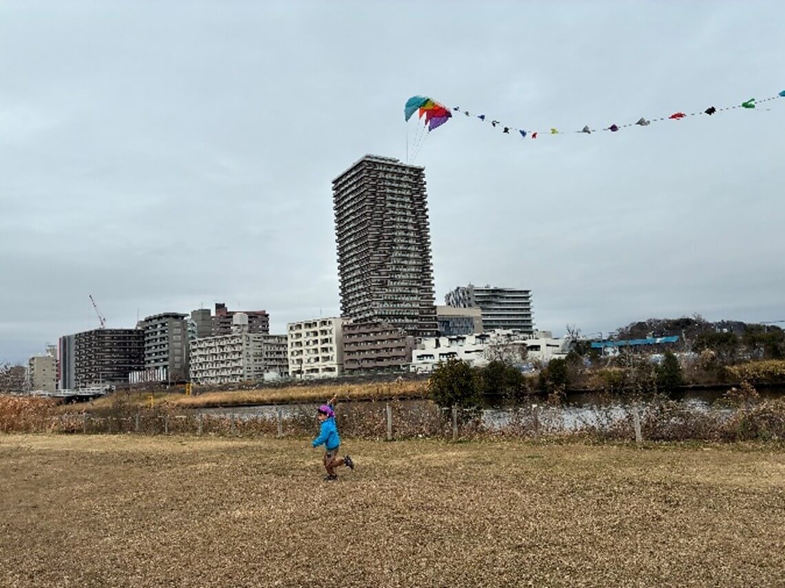 まず、幼児クラスでは、近くの河川敷にお散歩に行き、凧あげを楽しみました。