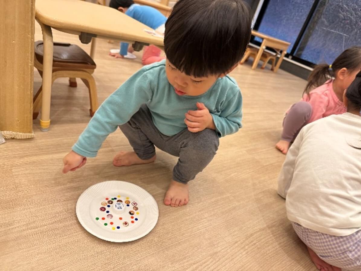 ペンギン組さんは、紙皿とキャップを使って、コマづくりを行いました。