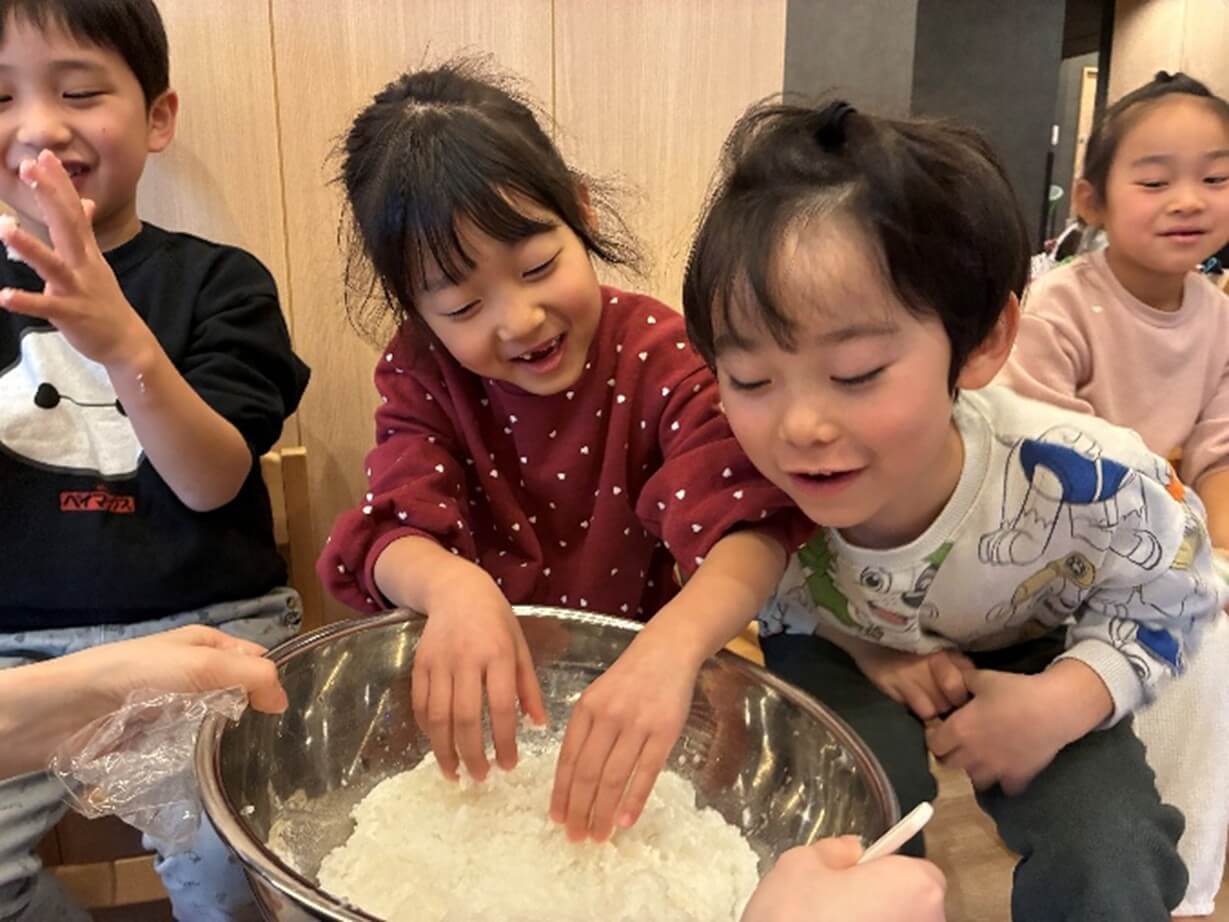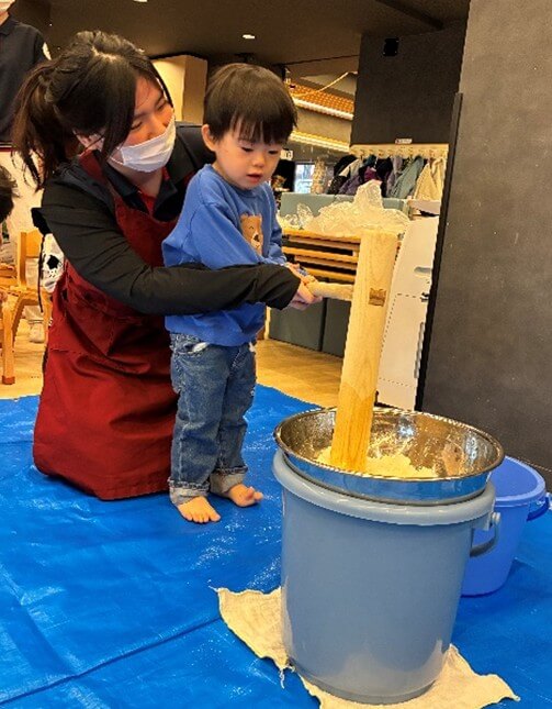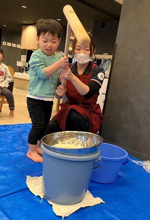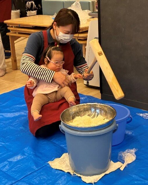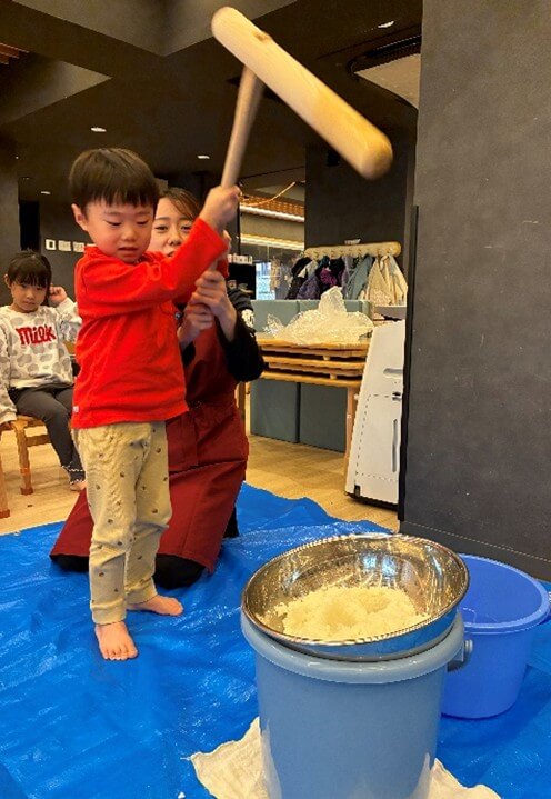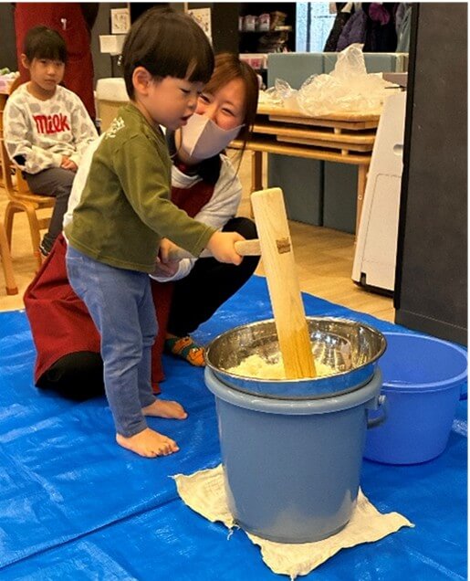 お餅つきでは、給食の先生が炊いてくれたもち米を、順番に杵でぺったんぺったんとつきました。