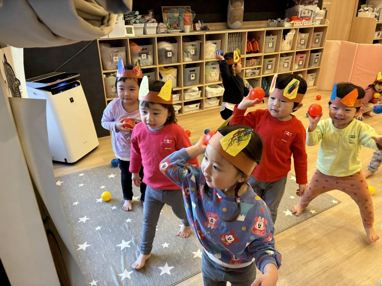 集いの後は、乳児室・幼児室に戻って、鬼の絵に向かってカラーボール投げを楽しみました。「おにはそとー!」と元気いっぱいにボールを投げ、笑顔あふれる時間となりました。
