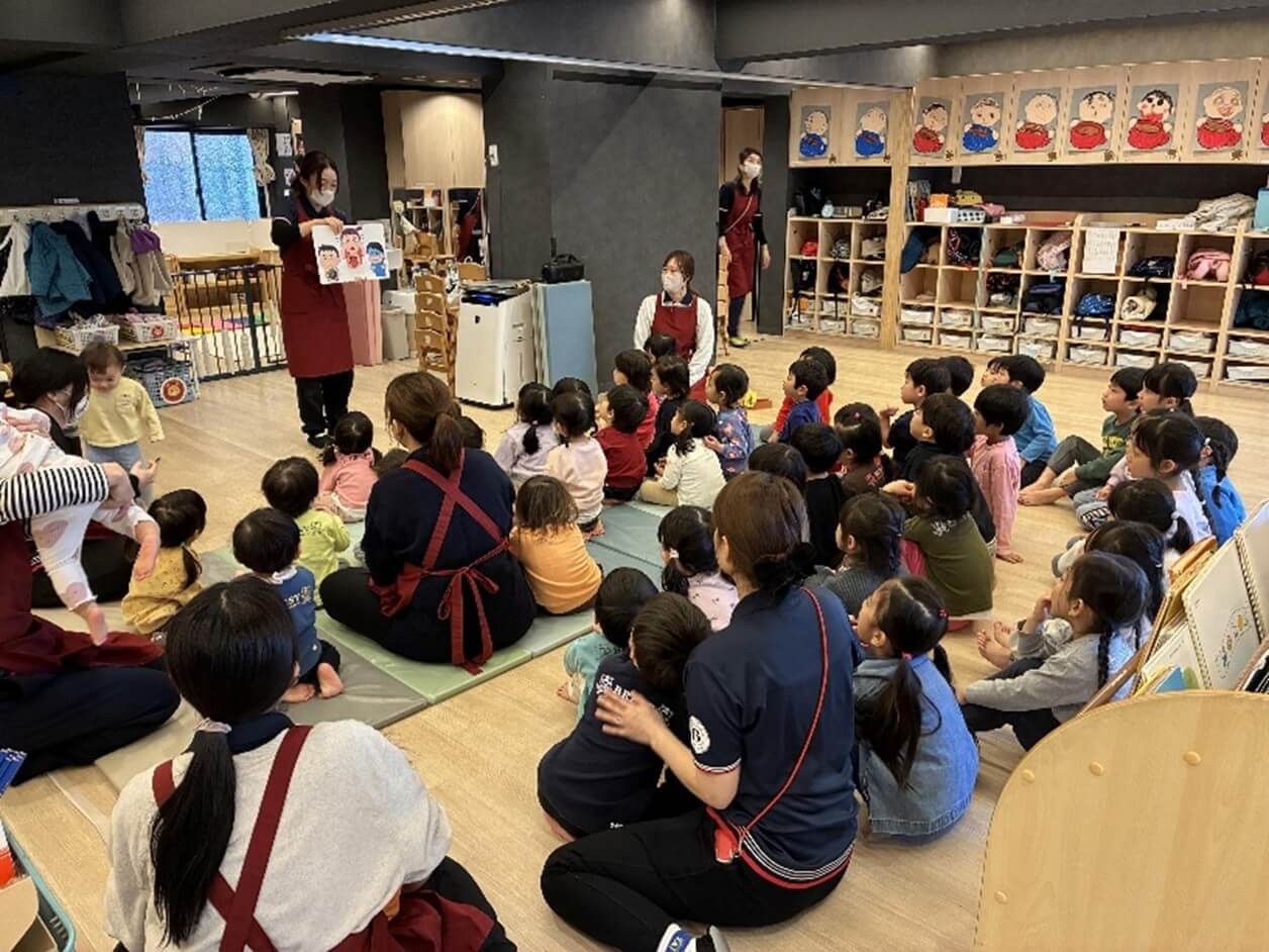 最初に、紙芝居を使って【節分ってどんな日?】というお話をしました。「鬼ってなに?」「どうして豆をまくの?」と、子どもたちは興味津々。 静かにお話を聞く姿がとても印象的でした。