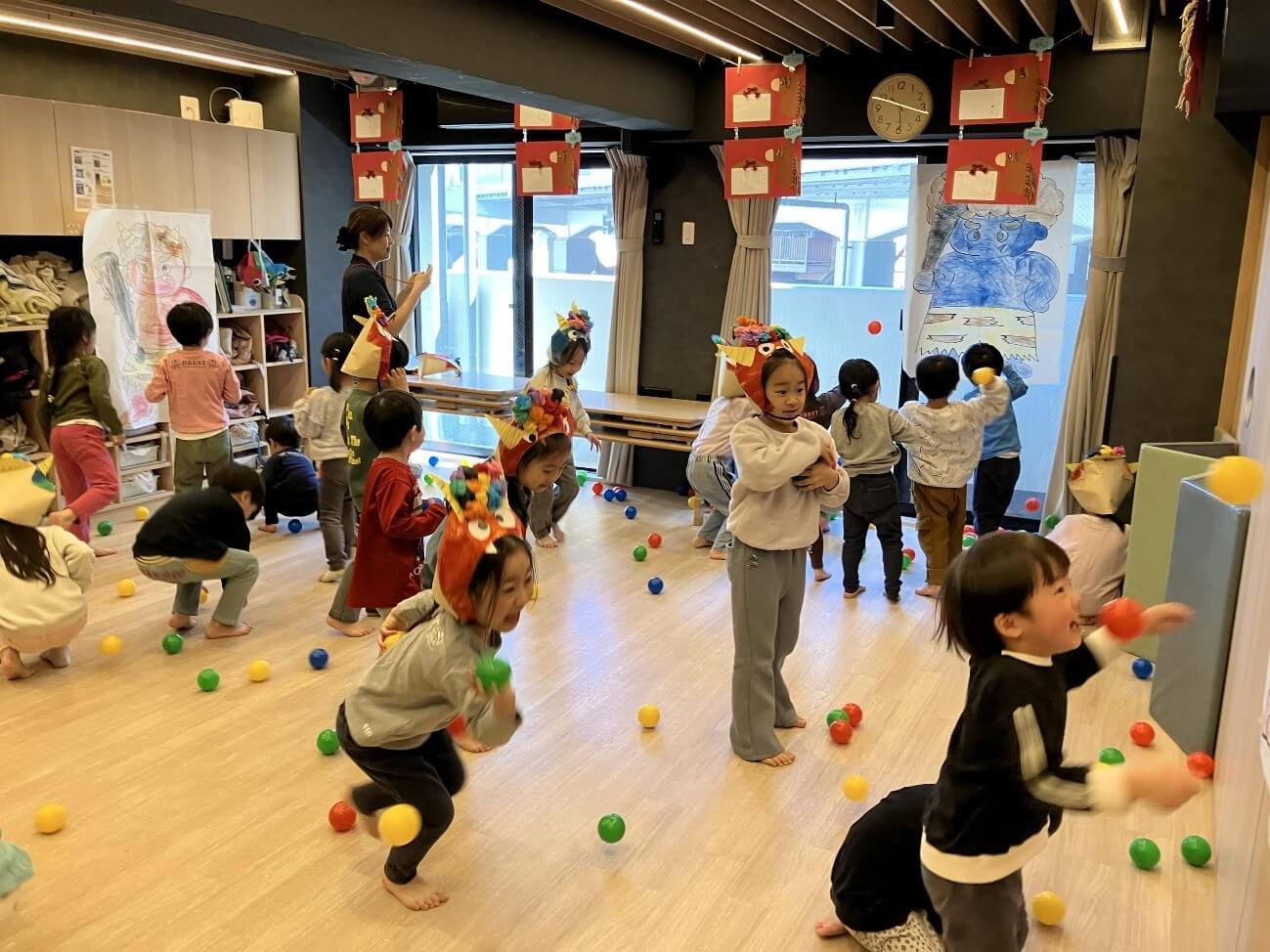 集いの後は、乳児室・幼児室に戻って、鬼の絵に向かってカラーボール投げを楽しみました。「おにはそとー!」と元気いっぱいにボールを投げ、笑顔あふれる時間となりました。