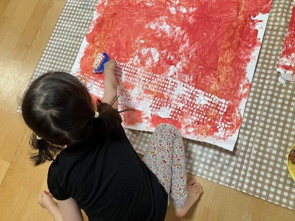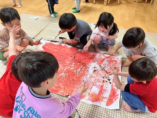 模造紙に赤やオレンジの絵の具で手形を付けました。絵の具の感触に驚きつつも、楽しく鯉のぼりの土台を作ってくれました!