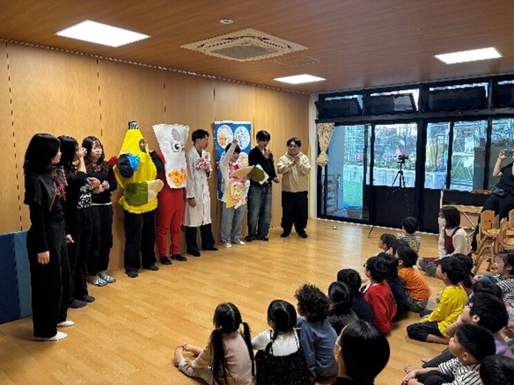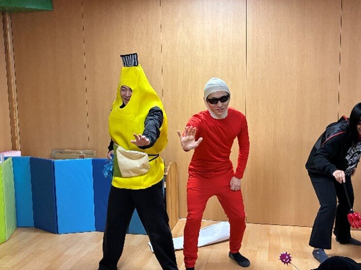 ウイルスは体のどこに入り込んでしまうのか、どうやってやっつけるのか、真剣な表情で劇を観覧する子どもたち。ウイルスたちの勢いに圧倒されていましたが、子どもたちの呼びかけで“おくすりマン”が登場すると、大きな歓声が聞こえてきました。