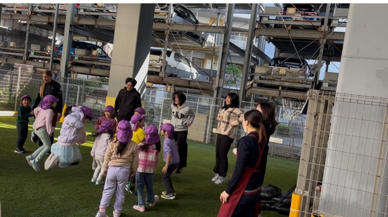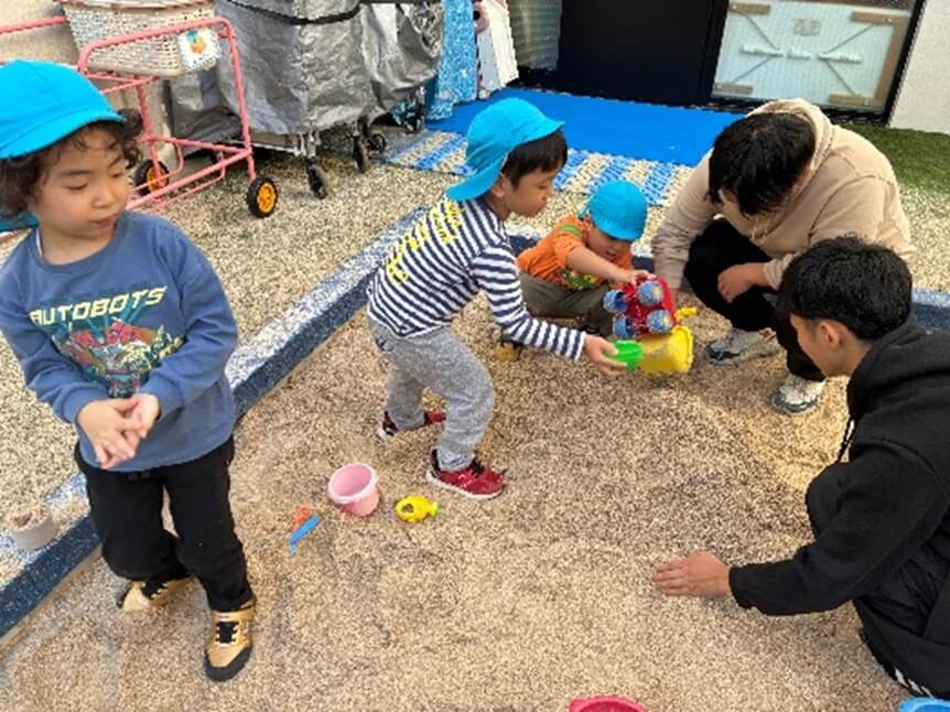 観覧のあとは学生さんたちと一緒に遊びました。砂場で一緒に山を作ったり、リレーを楽しんだりと、いつもの遊びが少し賑やかに。学生さんたちとの交流はあっという間でしたが、楽しい思い出がたくさんできました。